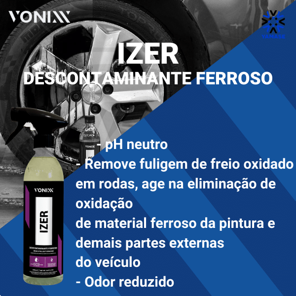 Izer é um removedor de manchas ferrosas de pH neutro que remove a fuligem oxidada dos freios das rodas, desoxida materiais ferrosos na pintura do carro e outros componentes externos e ajuda a remover manchas de ferrugem de componentes cromados. Em um motor, ajuda a remover a oxidação das peças metálicas, dando-lhe uma nova aparência. Este produto não é adequado para uso em superfícies galvanizadas.