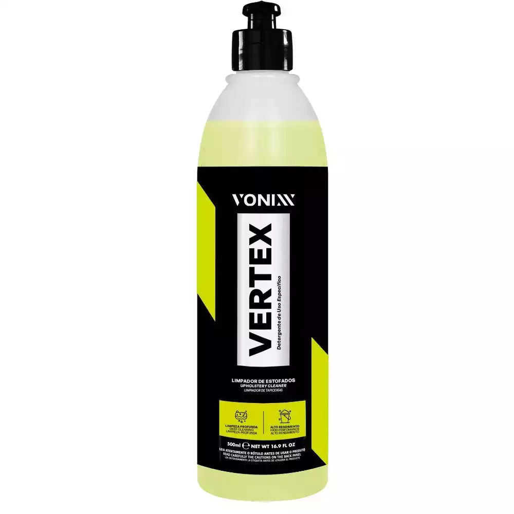 Vertex é um limpador de estofados automotivos e residenciais. O produto tem alta concentração de ativos a fim de aumentar o rendimento e limpar com eficiência. Observações importantes: Em caso de contato com cerâmica ou porcelanato, recomendamos enxaguar imediatamente para evitar possíveis manchas. O produto é alcalino e recomendamos o uso de óculos e luvas. Não recomendado para tecidos naturais como linho, seda, lã e demais tecidos naturais, pois poderá causar manchas. Em caso de limpeza de estofados automotivo, evitar respingar o produto em outras superfícies do veículo, tais como: couro, vidros, plásticos e demais superfícies internas do carro a fim de evitar manchas.